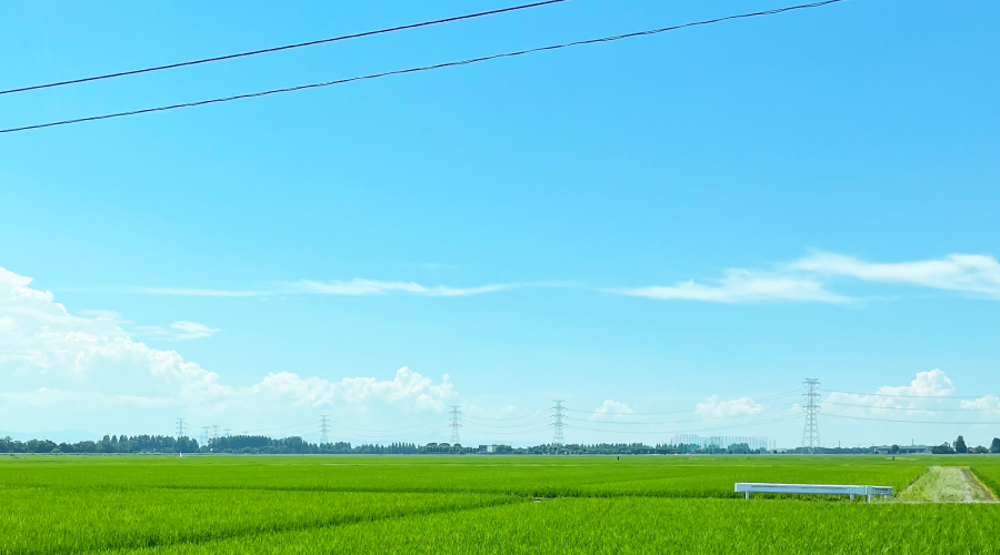 田んぼ道を横目に進むと、空と風を感じられる高い天井の建物。