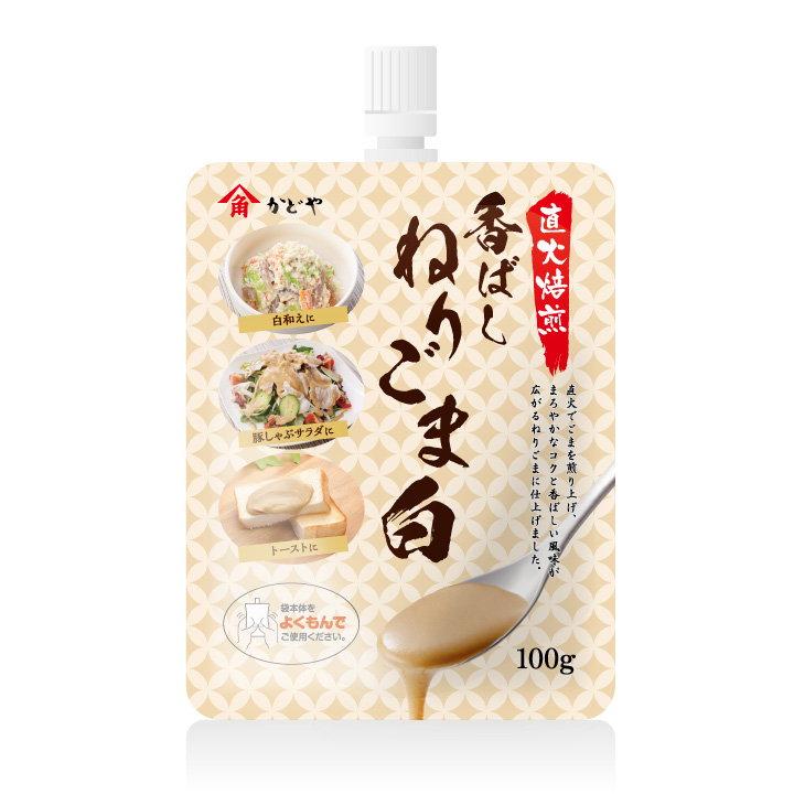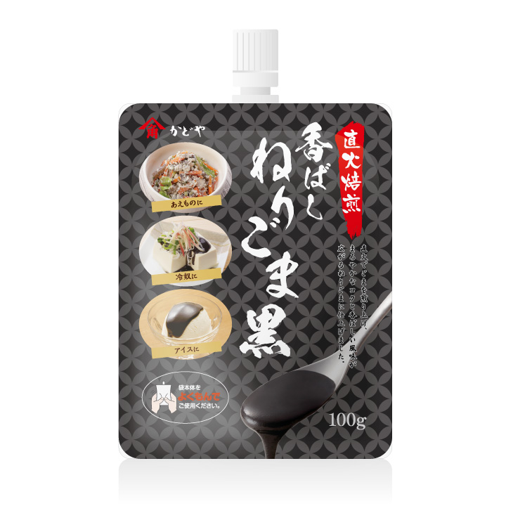 直火焙煎香ばしねりごま CL/かどや製油株式会社 2019.03.29 かどや製油株式会社様の新商品「直火焙煎香ばしねりごま」のパッケージをデザインさせて頂きました。和食はもちろんトーストやアイスなど様々な料理に使用できるので、幅広い年代の方が手にとり易いような、渋すぎない和風のデザインを目指しました。 BACK