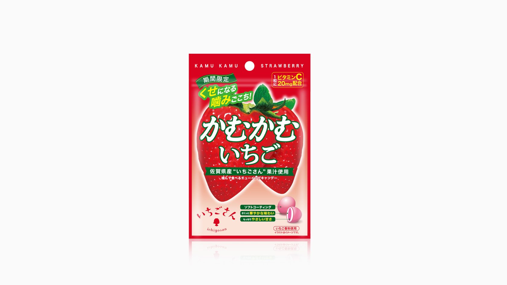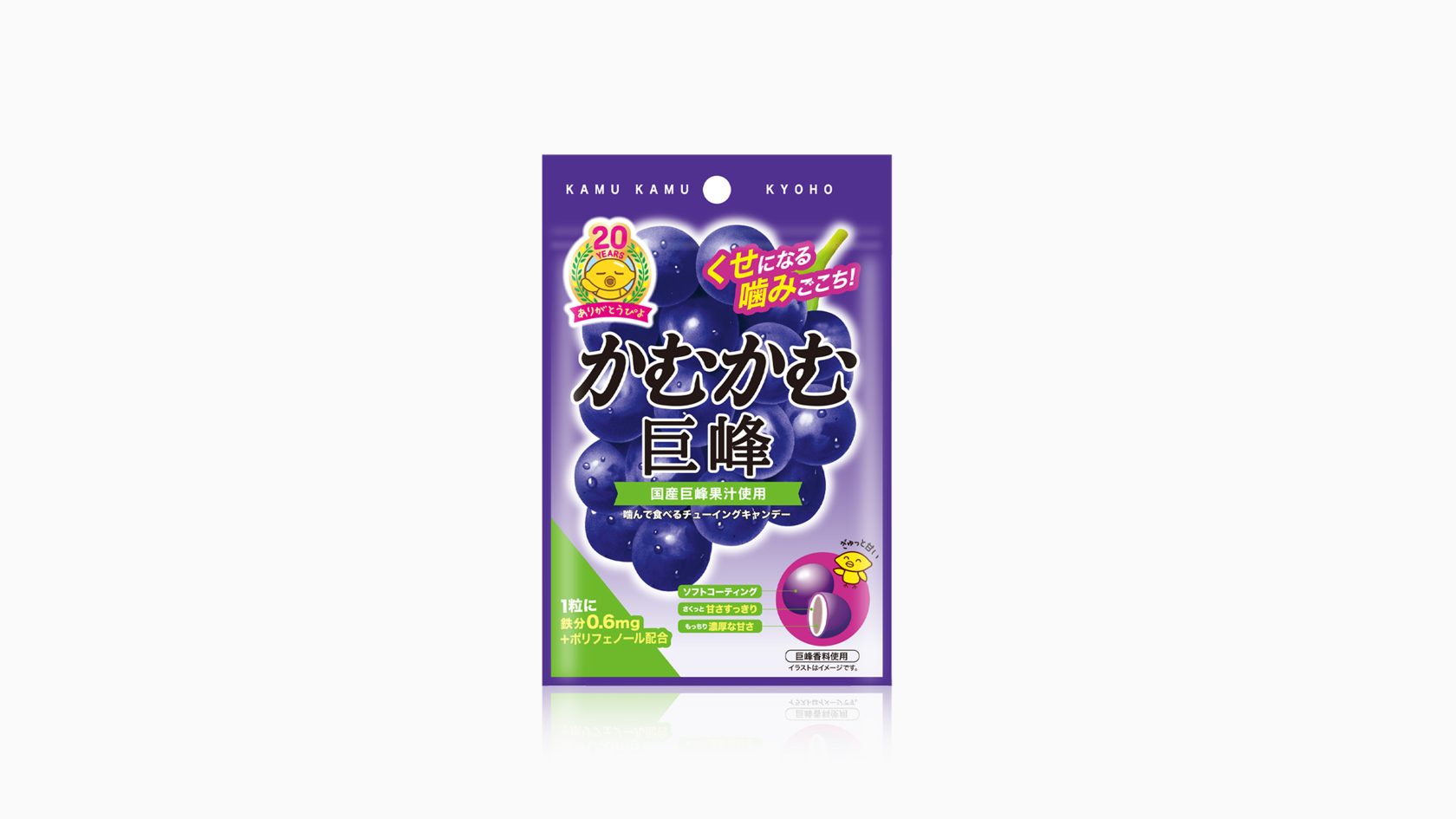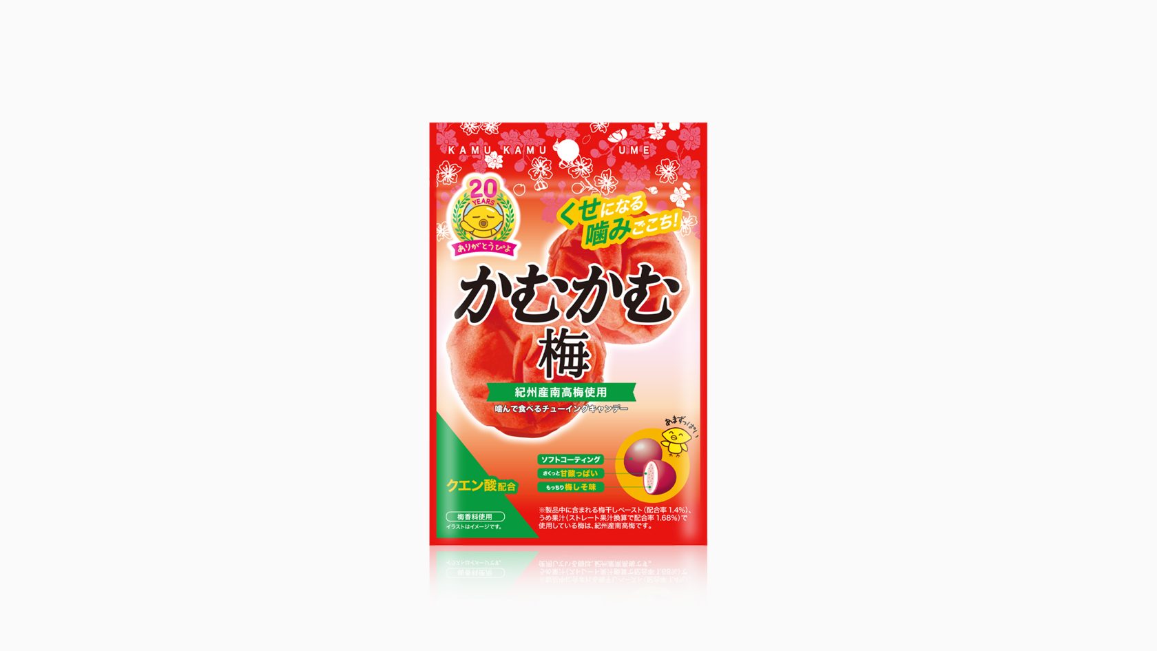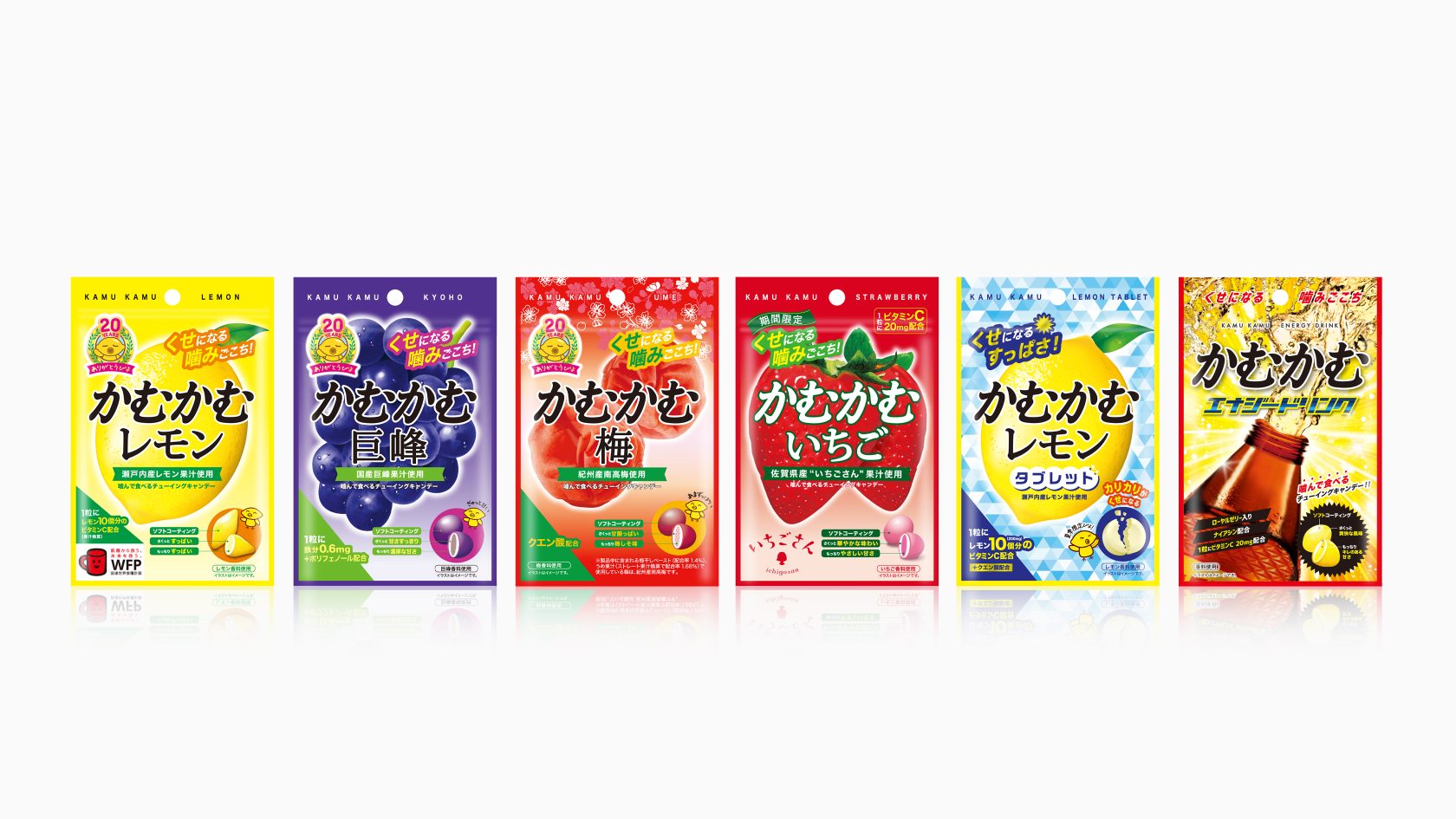 かむかむシリーズ CL/三菱食品株式会社 CD/小林 秀士D/小林 大介 2019.10.18 三菱食品株式会社さまより、 「かむかむシリーズ」のリニューアルデザインおよび かむかむ20周年ロゴのデザインを致しました。 従来のパッケージの雰囲気は継承しつつ、 食感の3層構造やカラーリング、シズルの見せ方などを再設定し、 より「美味しそう」なパッケージを目指しました。 かむかむシリーズ BACK