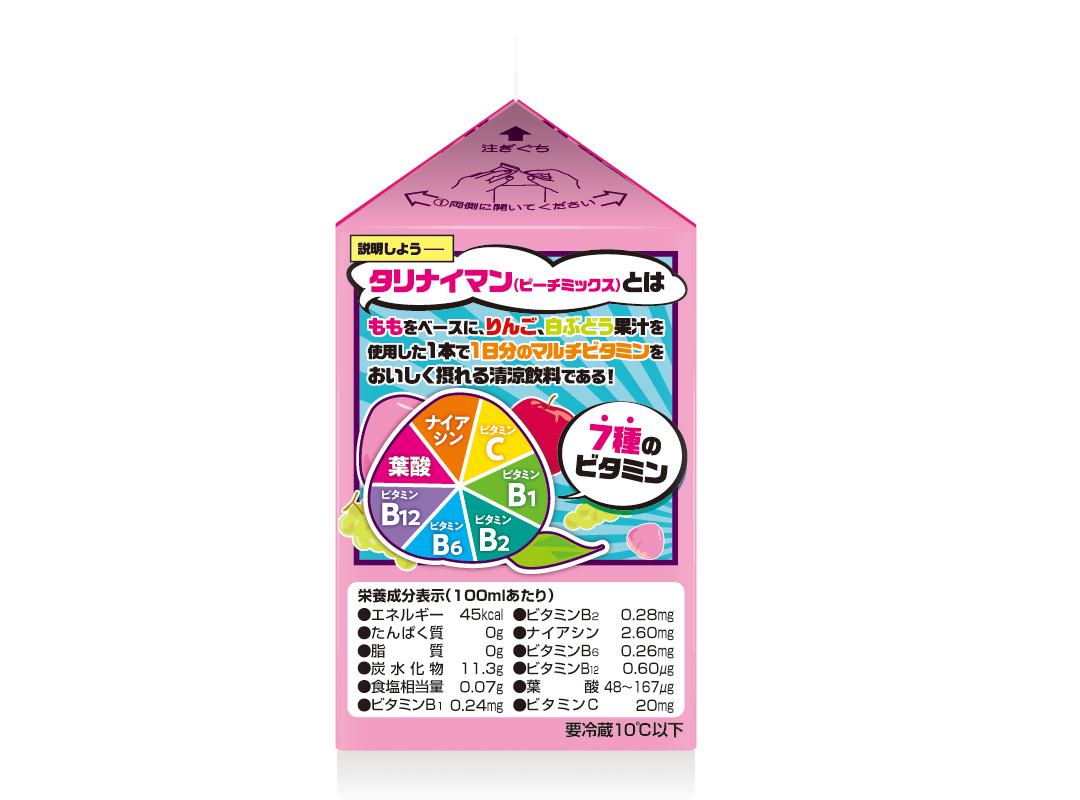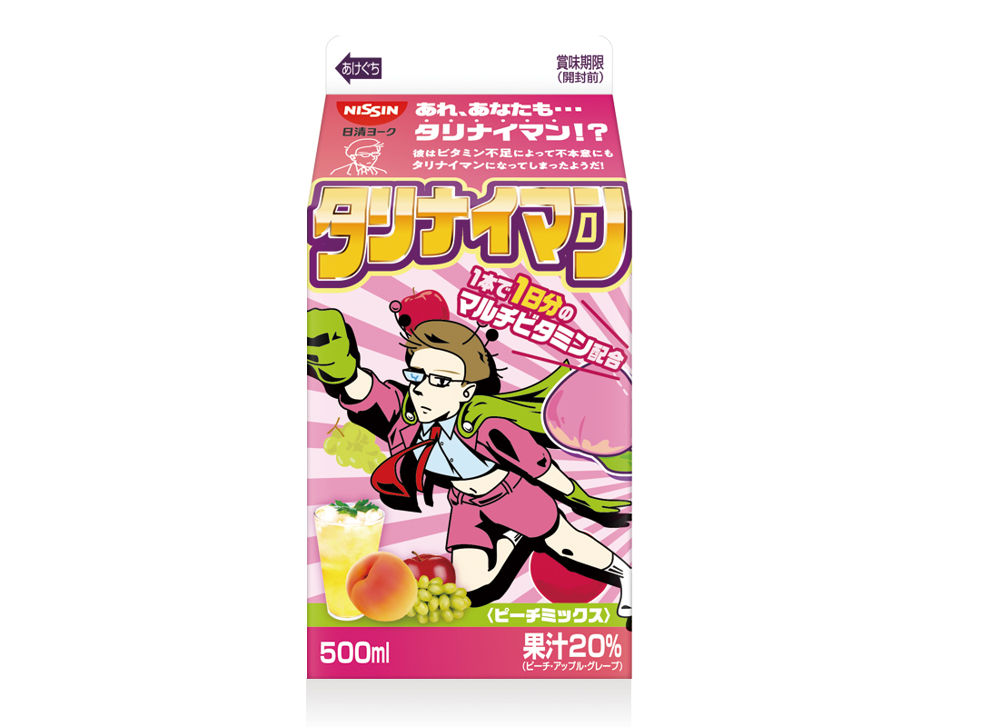 タリナイマン CL/日清ヨーク株式会社 D/三浦 純 2019.03.15 日清ヨーク株式会社様より、タリナイマンのデザインをさせていただきました。ももを中心にりんご、白ぶどう果汁を使用したおいしく1日分のマルチビタミンを摂ることができる清涼飲料水です。ビタミン不足により不本意にもタリナイマンになてしまった彼のようにはならないよう、店頭で見かけた際には是非お手にとってみてください。日清ヨーク株式会社 BACK