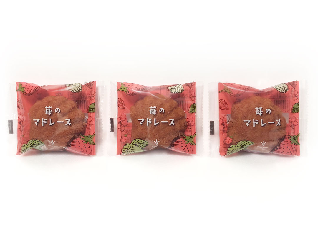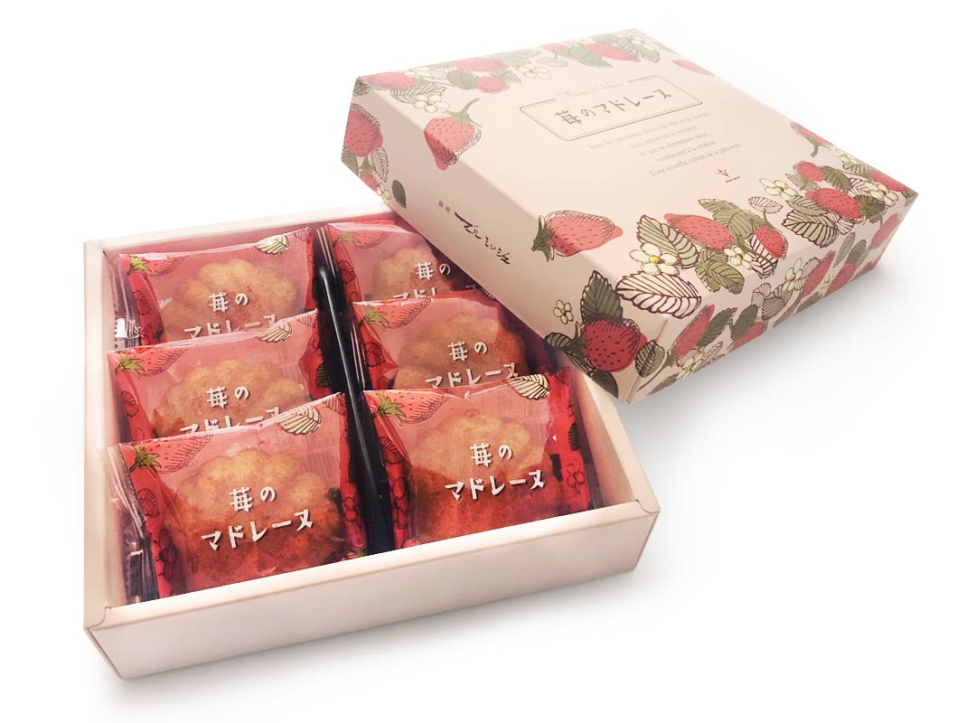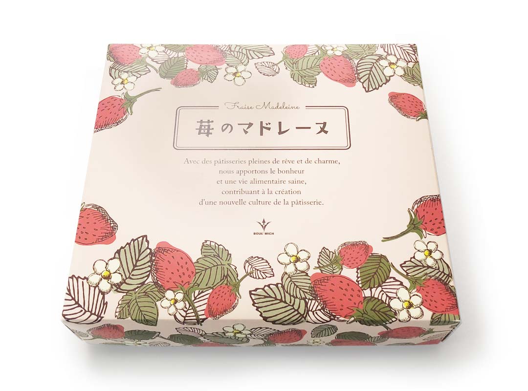 苺のマドレーヌ CL/株式会社ブールミッシュ CD/秋山 佑太D/松岡 海椰 2019.04.05 ブールミッシュ様より「苺のマドレーヌ」のデザインを担当させていただきました。苺の果実と葉と花のモチーフを手書きイラストで描き起こし、淡い色合いで春を思わせるようなデザインを目指しました。BOUL’MICH BACK