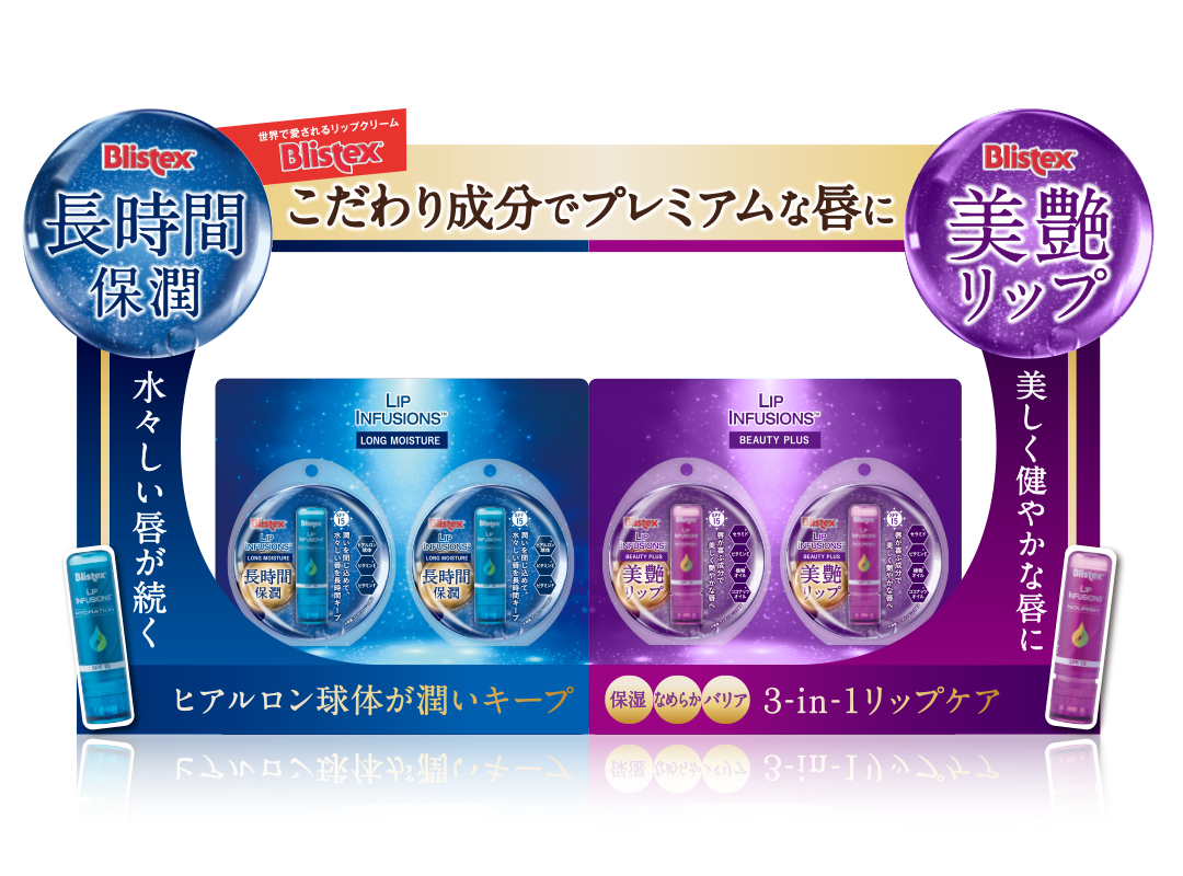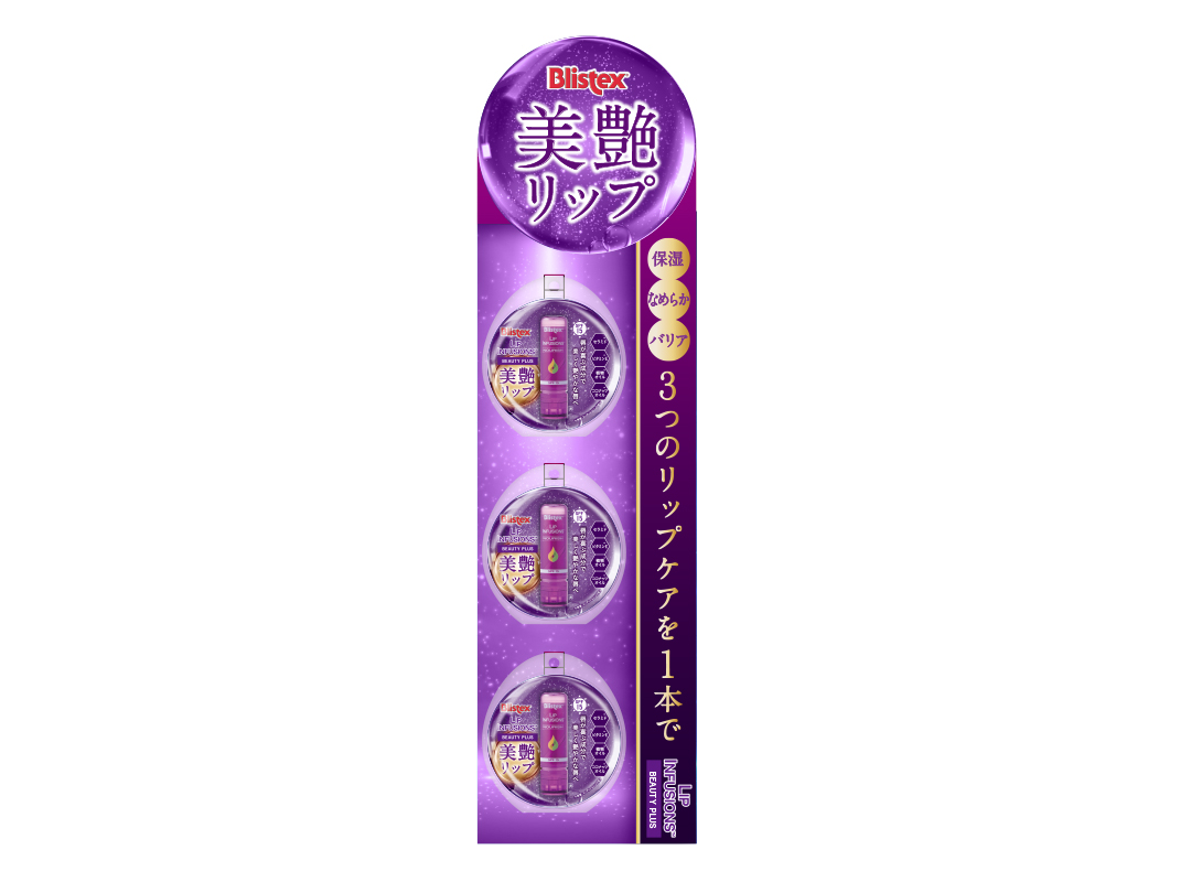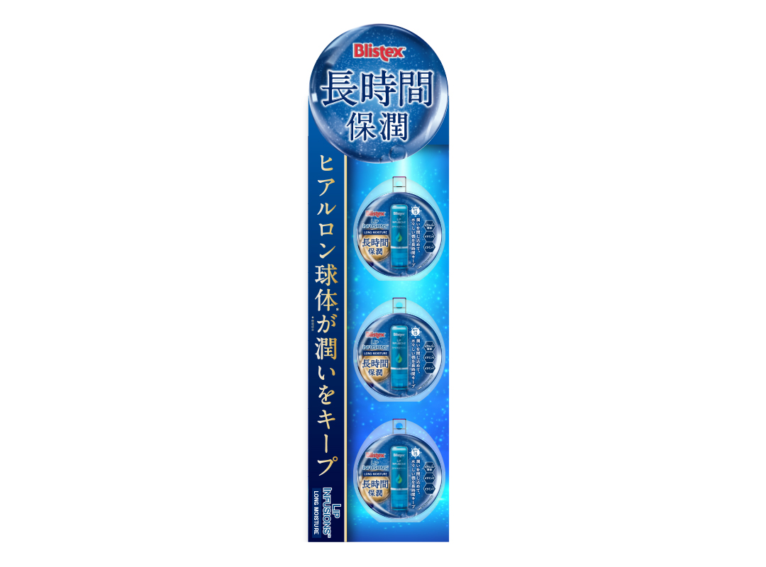 LIP INFUSIONS CL/ピルボックスジャパン株式会社 2019.07.24 ピルボックスジャパン株式会社様でBlistexブランドからLIP INFUSIONSというリップクリームの日本版パッケージと販促ツールを担当させて頂きました。ヒアルロン球体という保湿成分が特長なのでデザインも球体をコンセプトに制作しました。 BACK