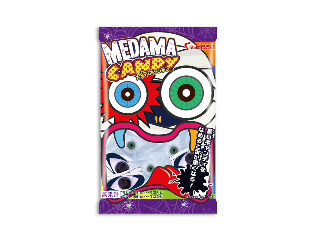 MEDAMA CANDY CL/株式会社ハート CD/山本 康雄 2019.10.17 株式会社ハート様の「メダマキャンディ」のパッケージをデザインさせていただきました。 リアルな目玉型細工飴と舐めると舌が黒くなるキャンディの詰め合わせです。 ハロウィン菓子ということで怖すぎず可愛すぎず、 全年齢楽しめるおどろおどろしさを意識したデザインに。 黒い飴の個包装は包帯から除くミイラの黒目をイメージしています。 株式会社ハート BACK