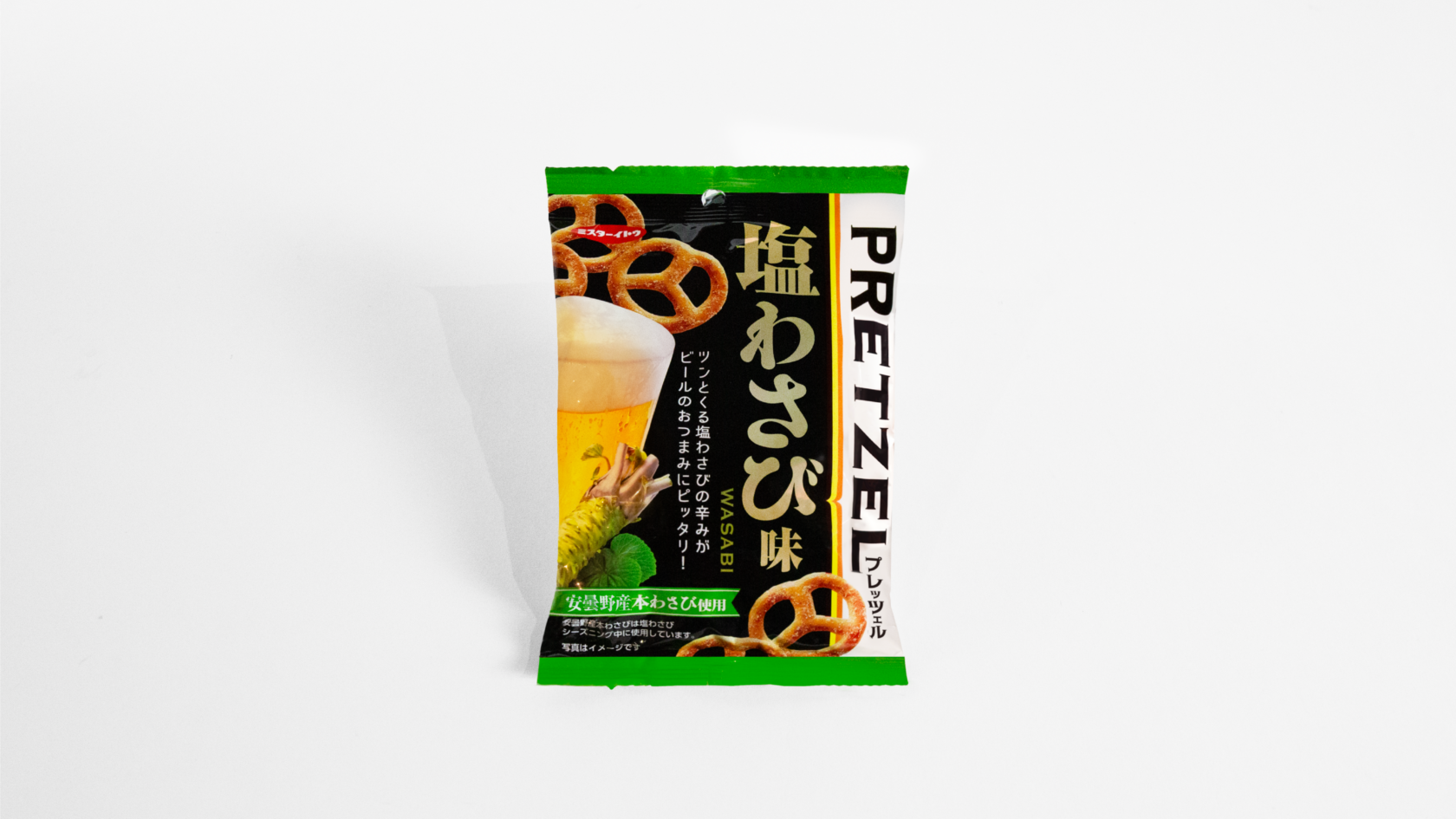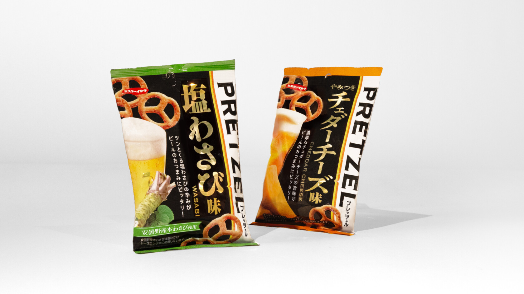 PRETZEL塩わさび味・チェダーチーズ味のデザインを担当させていただきました。
