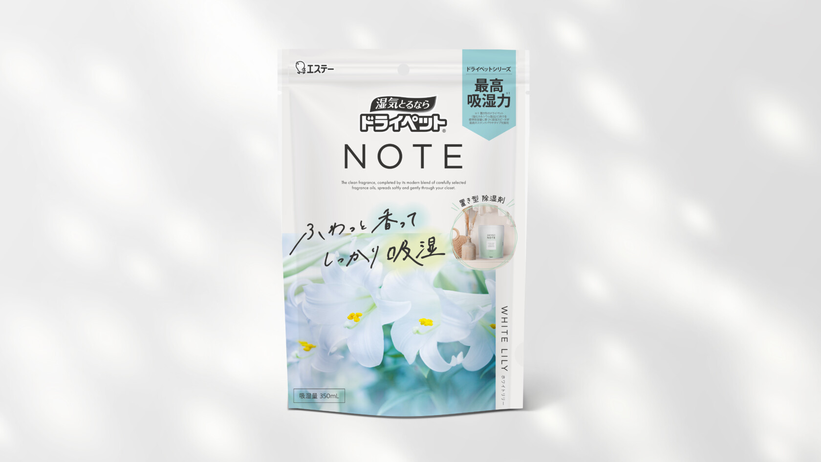 防虫剤「ムシューダ NOTE」を踏襲しつつ、香りながらも吸湿してくれる製品特徴を訴求。