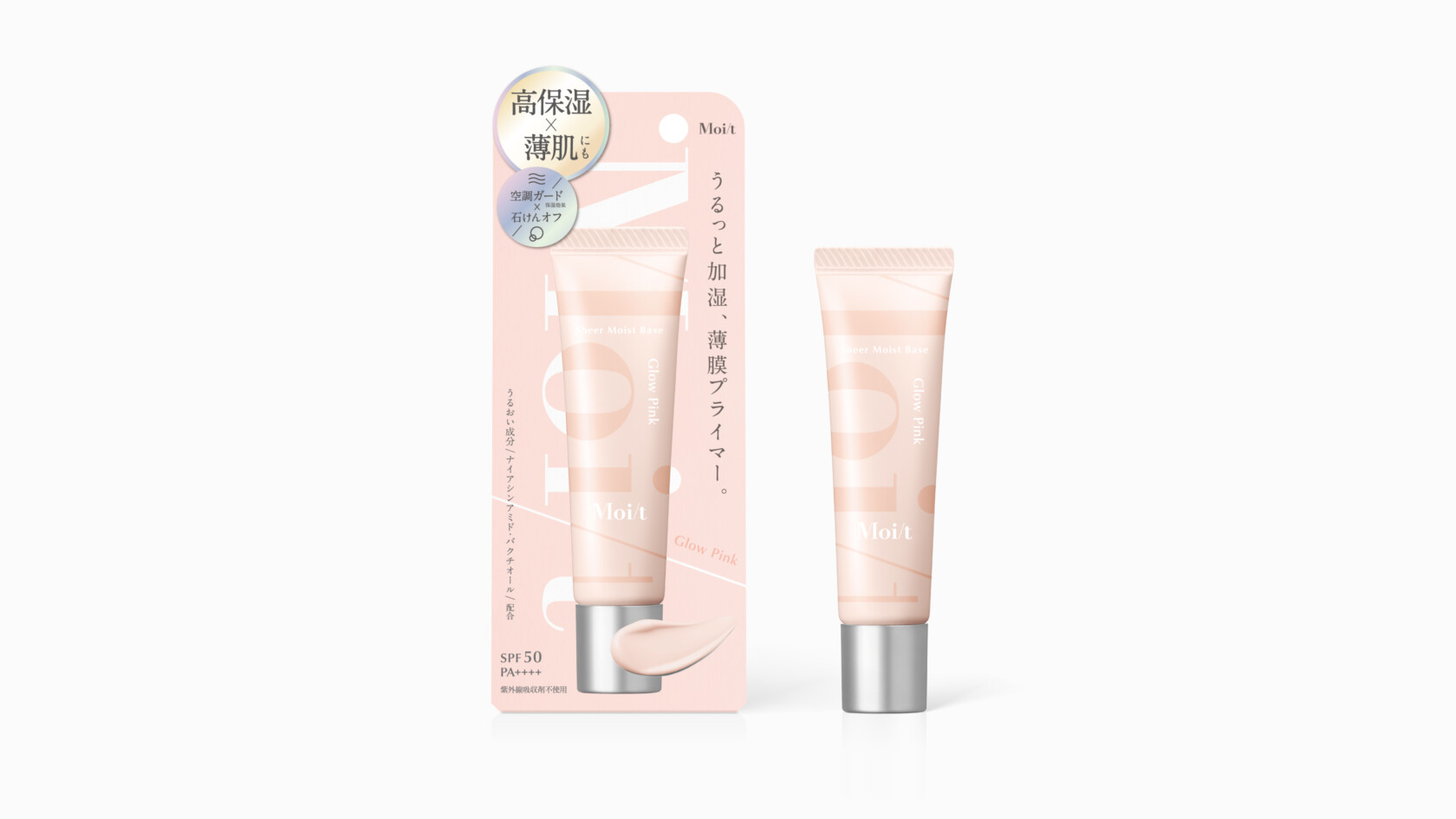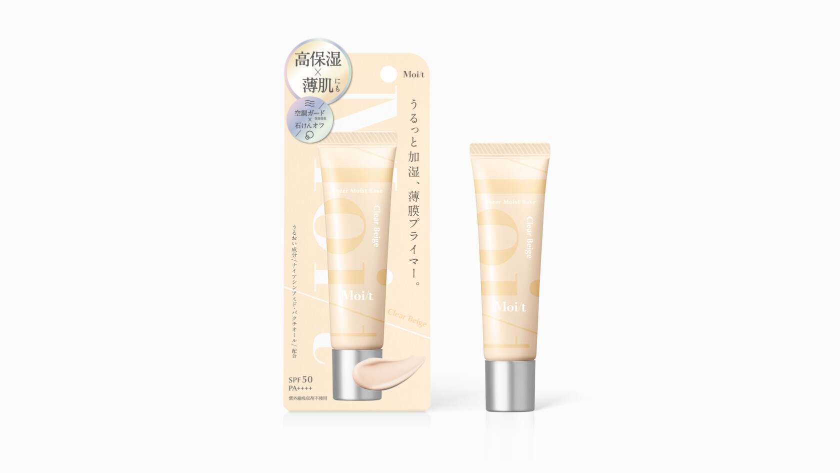 Moi/t CL/株式会社エリザベス CD/森 萌也D/楫 直晃 2025.10.03 株式会社エリザベス様の Moi/t(モイット) シアーモイストベースの パッケージとATシールのデザインを担当いたしました。 薄付きで肌本来の透明感を生かす、 もっちり高保湿化粧下地です。 「Moi/t」のロゴをチューブと箱に透過させ、 薄づきで素肌をキレイに見せる商品特徴を表現しました。 BACK