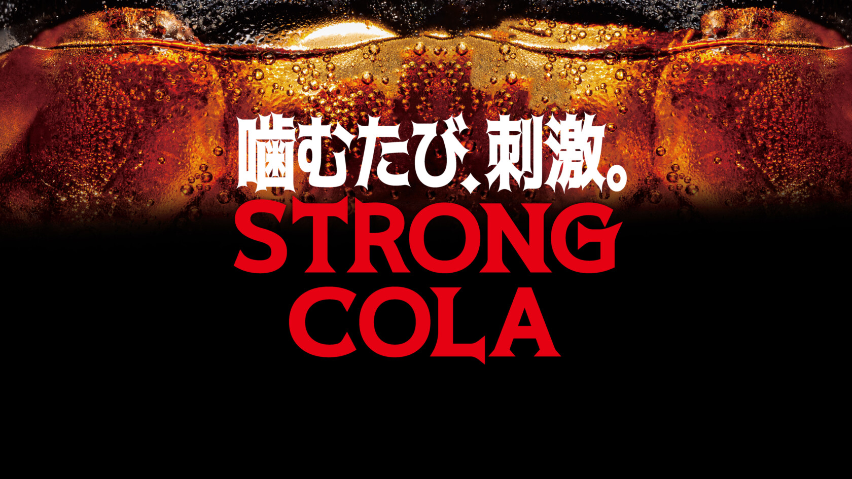 コーラの爽快感は、液面としぶきが飛ぶグラスのビジュアルで演出。