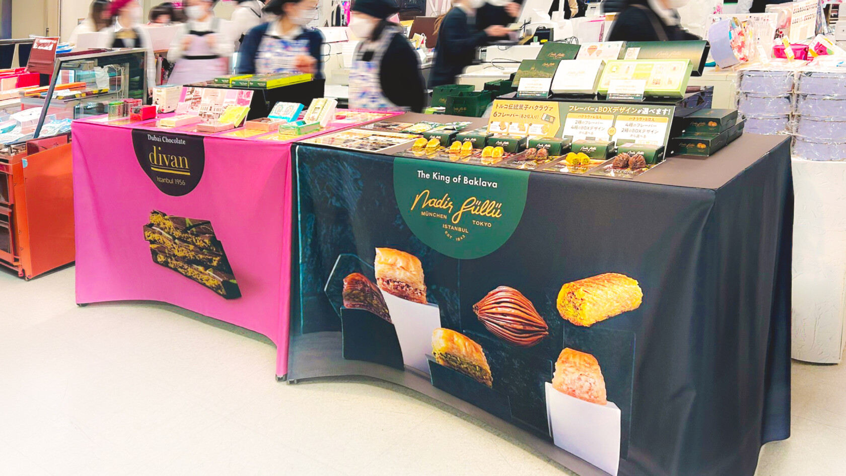 divan ナーディル・ギュル バレンタインディスプレイ CL/株式会社エフェトレーディング CD/橋本 直大D/松本 航太郎D/竹川 愛紗 2026.03.09 株式会社エフェトレーディング様より、 ラグジュアリースイーツブランド「divan」と、 トルコ伝統菓子バクラヴァの高級老舗ブランド 「ナーディル・ギュル」の バレンタインディスプレイをデザインさせていただきました。 今年は全国18箇所の催事に出展。 それぞれのブランドの世界観に合わせ、 divanでは華やかさと上質感を、 ナーディル・ギュルでは高級感と伝統感を与えるデザインに仕上げました。 divanナーディルギュル BACK
